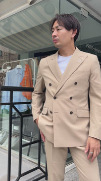 店頭で大人気のセットアップ。一度購入された方のリピーター率がかなり高い1着です。これまで明るめベージュを着たことのない方でも着てみると高級感があり、いつもと違う自分に出会える感覚でとても喜ばれることが多いのも特徴です。シャツとネクタイを合わせてフォーマルなシーンに、Tシャツを合わせてカジュアルに、どちらも使える万能アイテム。